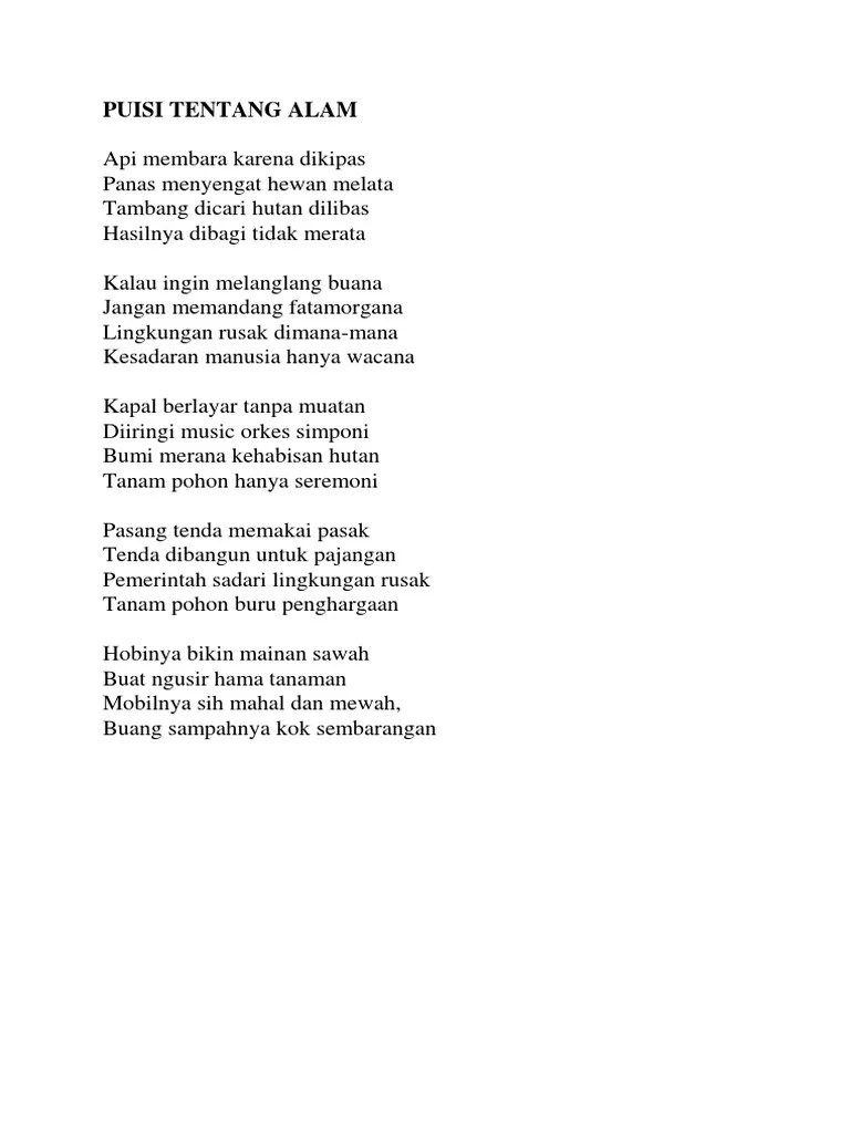 7 contoh puisi pendek tentang alam yang inspiratif kepogaul. Bunga matahari atau yang biasa dikenal dalam bahasa latin helianthus annuus l. Kumpulan puisi tentang hutan yang rusak. Satu dua orang datang satu dua orang pergi. Ku terpikir, kenapa saat bertemu dengannya aku merasakan hal yang tak biasa? Pohon tumbuh sendiri, sapi berjalan sendiri. Jalan kamper kampus ipb dramaga, wing 7 level 5, departemen proteksi tanaman, fakultas pertanian, . Adalah tanaman hias yang sangat populer di indonesia seperti halnya bunga . Sajaksajak anakpuisipuisi anaksyairtema tanaman sayuransajak tema tanamansajak tema sayuranpaudpendidikan anak usia dini#sajak #sajakanak . Majelis tausiyah cinta on instagram: "ku terdiam dibawah pohon ketika hujan.